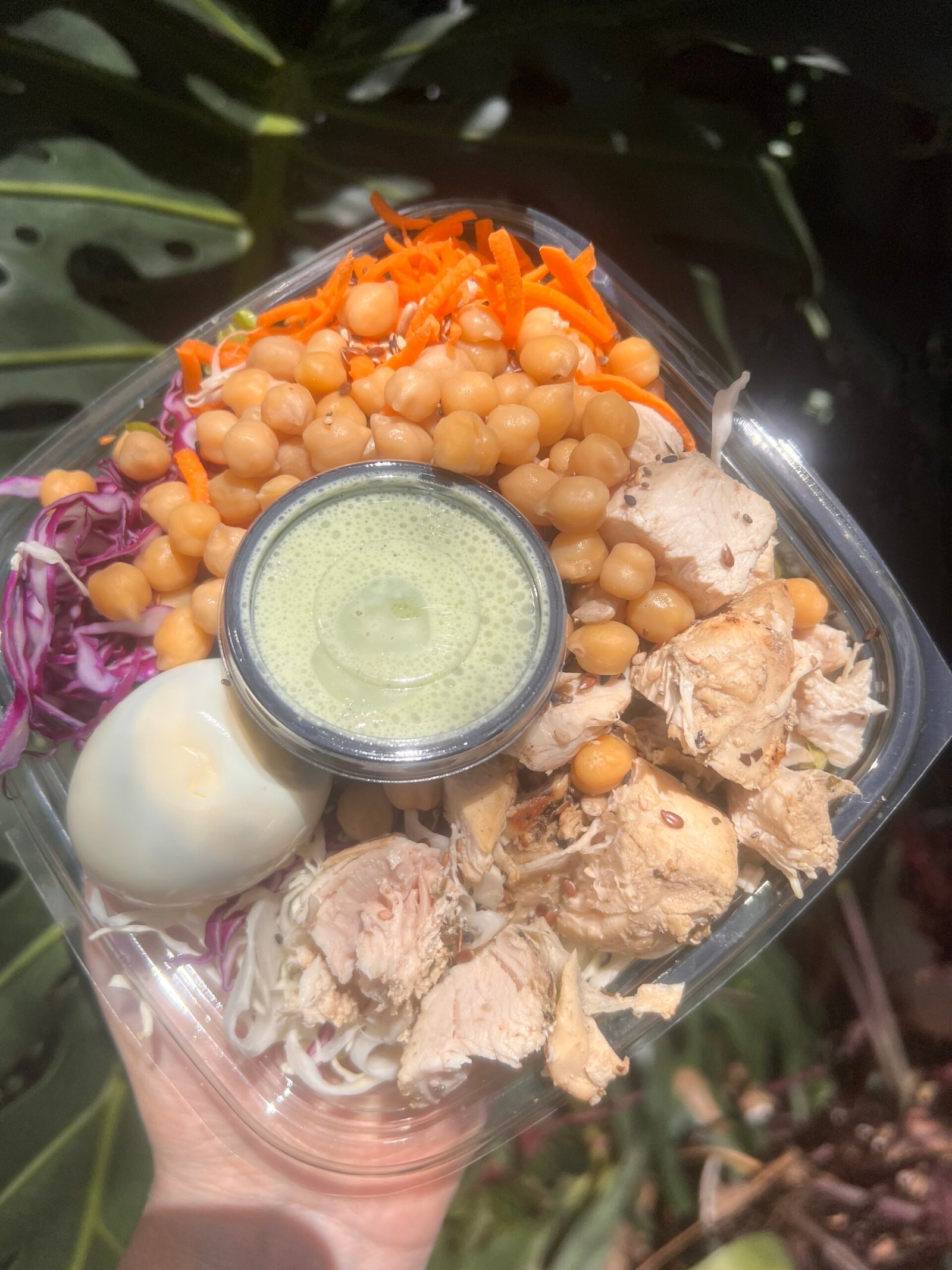 Lechuga, zanahoria rallada repollo blanco y morado ,garbanzo, con pollo grillado y huevo hervido, más salsa de albahaca